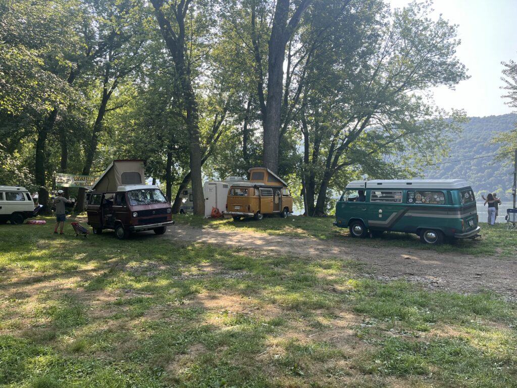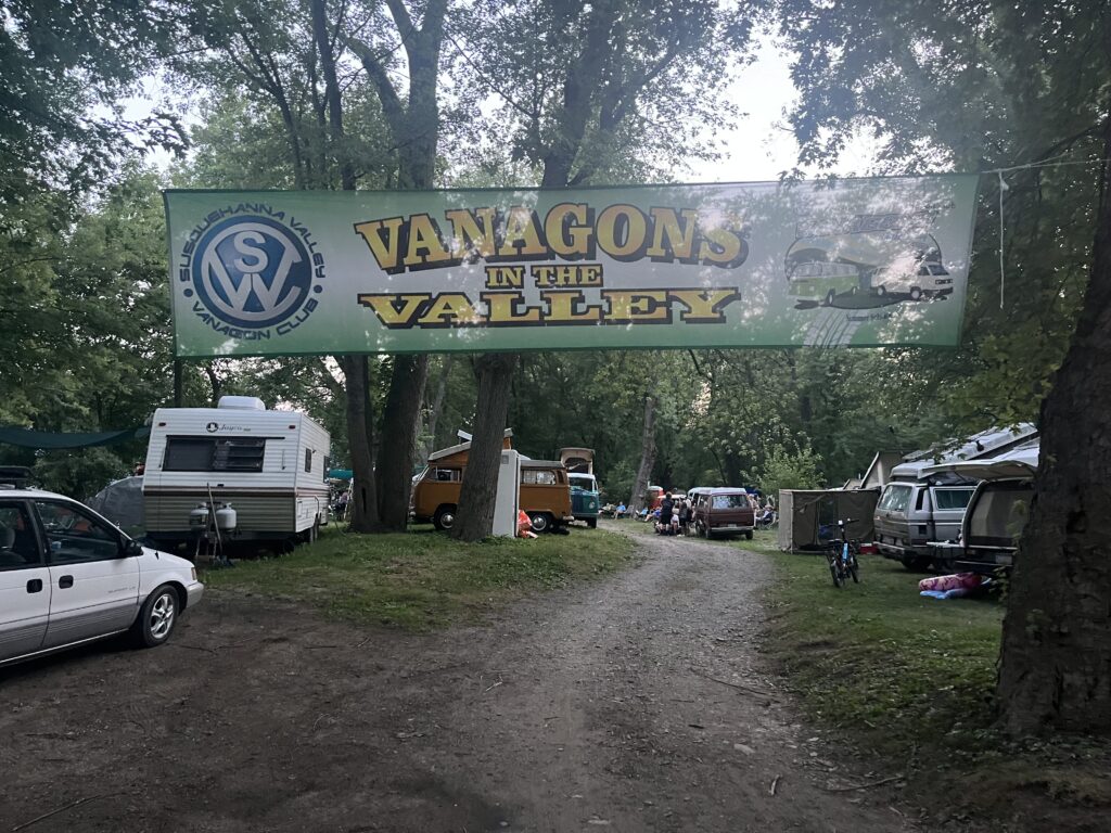 We left after work on Friday and made our way to Duncannon, PA, to one of the most interesting “campsites.” It is basically a little valley that is flanked by the river on one side and an active railroad line on the other, with trains going back every 30-60 minutes. It’s a bit swampy, buggy, and during Vanagons in the Valley, filled with an eclectic group of people all owning Volkswagen vans (I say that with admiration).