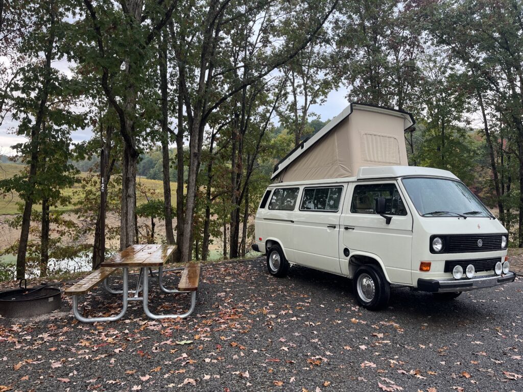 We ended up driving to Battle Run Campground on Summersville Lake, West Virginia. We arrived around 9pm, and I was a bit afraid they were going to turn us away. At first, it seemed they were when they said they weren’t taking reservations. We said we would be happy to pay, and the manager said we could just go in! We could pick any spot we wanted out of the entire park for free! We chose a site fairly close to the entrance in between a nice built-out van and a beautiful airstream. Had the lake not been drained, it would’ve been a beautiful lakeside view too. We were so grateful for our campsite, especially when it started to pour throughout the night.