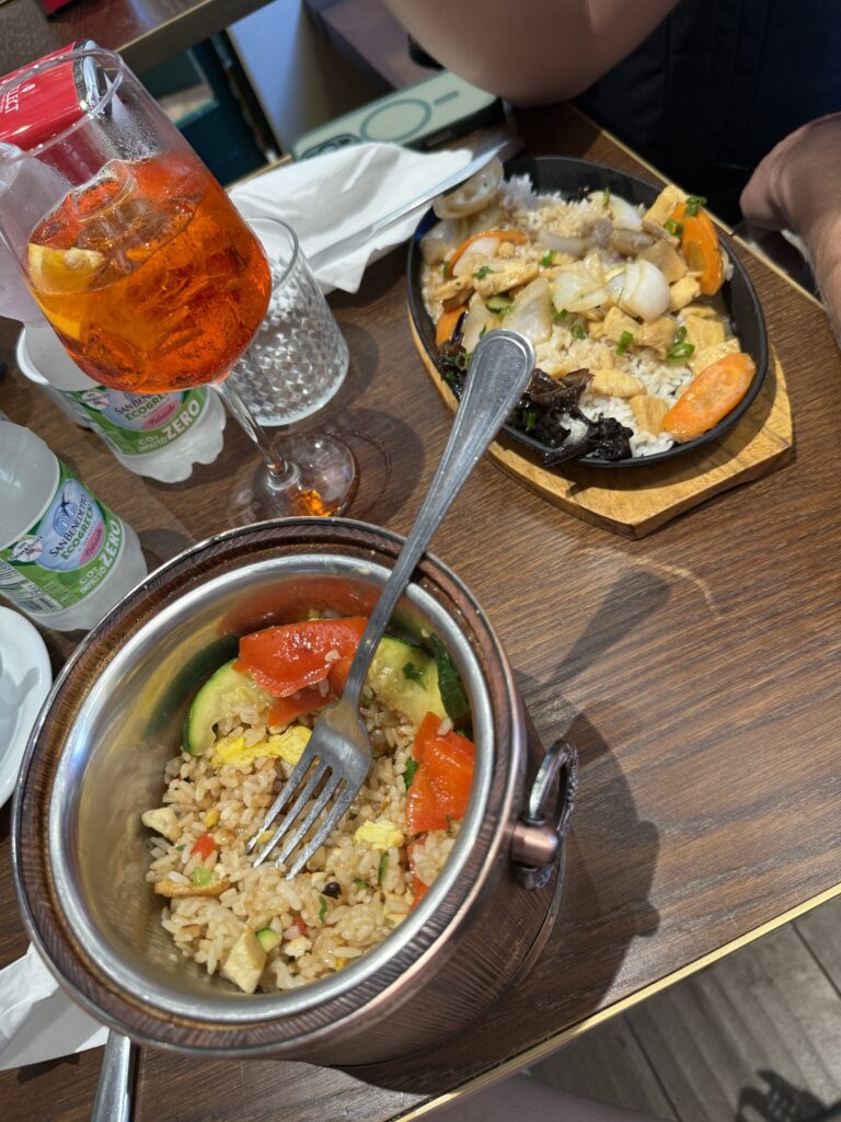 We found a couple options, and after some convincing, I decided on Green Gem, a Chinese Italian restaurant that had choices that sounded similar to home, including a chicken vegetable stir fry that sounded AMAZING. I ordered that and Jeff ordered a steamed version along with an aperol spritz for him and a cappuccino for me. It. Was. Life. Giving. I kid you not, in the land of pasta and pizza and all of the Italian food I’ve dreamt of for the last decade, this rice stir fry was my FAVORITE meal of the entire trip. I am STILL dreaming of this meal. It was SO flavorful. Jeffrey’s especially had a delicious blend of spices, and lucky for me, he didn’t want his vegetables or the salty seaweed they had included on his plate, so I got to add them to my rice bowl. It was perrrrfection. I was so happy to have rice! Jeff wasn’t a fan of the spritz, but I thought it was good! It felt right to officially say I had an aperol spritz in Italy.