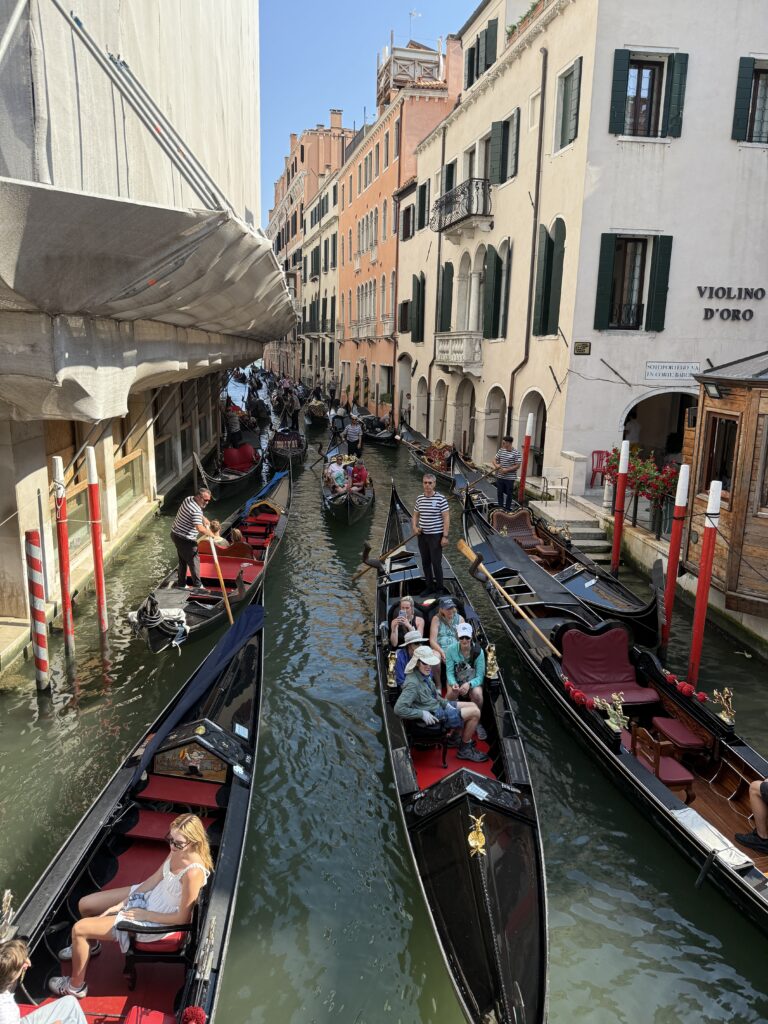 When you envision a gondola ride through the waterways of Venice, you’d imagine it being this relaxed, private, personal experience. It is not. The gondolas cram the small waterways and cannot get into the larger ones because of the larger boats with engines. Due to this and observing many gondola rides walking through Venice, we opted for the electric boat tour, which went through larger waterways and had a more complete tour.