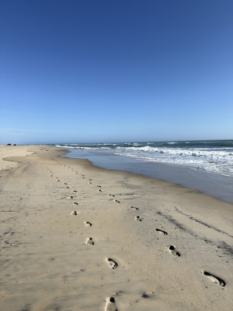 We settled into our campground and booked it to the beach. Our camp site was directly behind a sand dune, and we had about a 5 minute walk over the dunes to the beach. It was a bit strenuous, as it was uphill to go over the sanddune and the sand was very soft and moved under your feet. Due to this, I spread my toes out as much as possible to gain traction in the sand, which would be my demise due to the landscape!