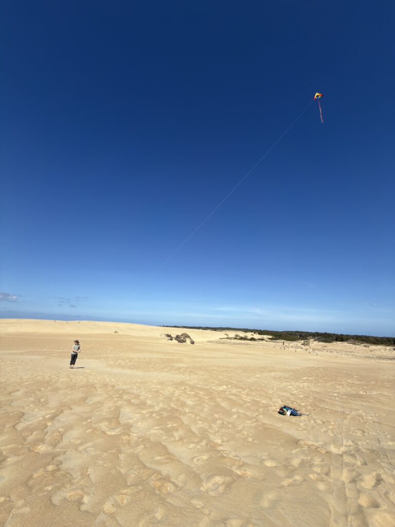 Excited to use his new kite, we raced the hour back to our campground and quickly gathered a small bag of things for our final beach day. It took a few tries to get the kite in the air (there was much less wind this afternoon than on previous days), but once he got the hang of it, he was zipping the kite all over the sky! It was fun to watch. I tried a few times and started to get the hang of it, but I plummeted the kite numerous times straight into the ground. The bar that you hold feels like you should steer it side to side in like in a car, but in reality, you have to pull the bar toward you to maneuver the kite left and right, similar to how you’d use bike handle bars. I did get the basics, but I definitely wasn’t doing the tricks Jeffrey had started performing!