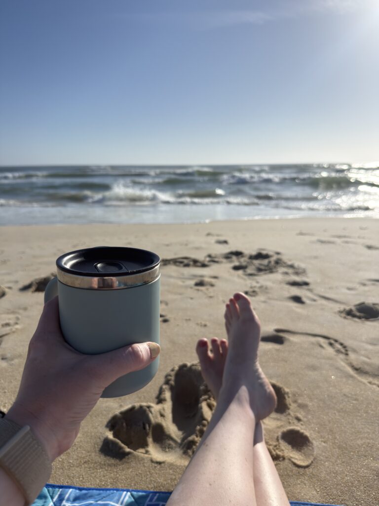 I woke up early Tuesday morning and started getting ready for the long drive home. I got myself ready, made coffee, toasted our bagels, and coaxed Jeffrey to get ready so we could squeeze in a beach walk before we left.