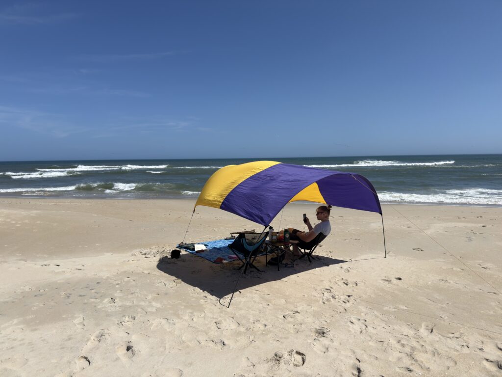 Saturday morning, Jeffrey was tired and wanted to sleep in a little bit, so I made my way to the beach solo for my morning coffee. Dolphins greeted me upon my arrival which made it all the more special. I set up my blanket and sat, watching the birds, listening to the ocean, and enjoying the comfortable breeze. Jeffrey joined me not long after and me met a couple dogs named Max and Angel (they were large dogs with short hair and were breeds I had never heard of!). We decided that today was the last warm day on the radar and the perfect day for a beach day. We decided that we should get some sort of shade so we weren’t cooking in the sun all day.